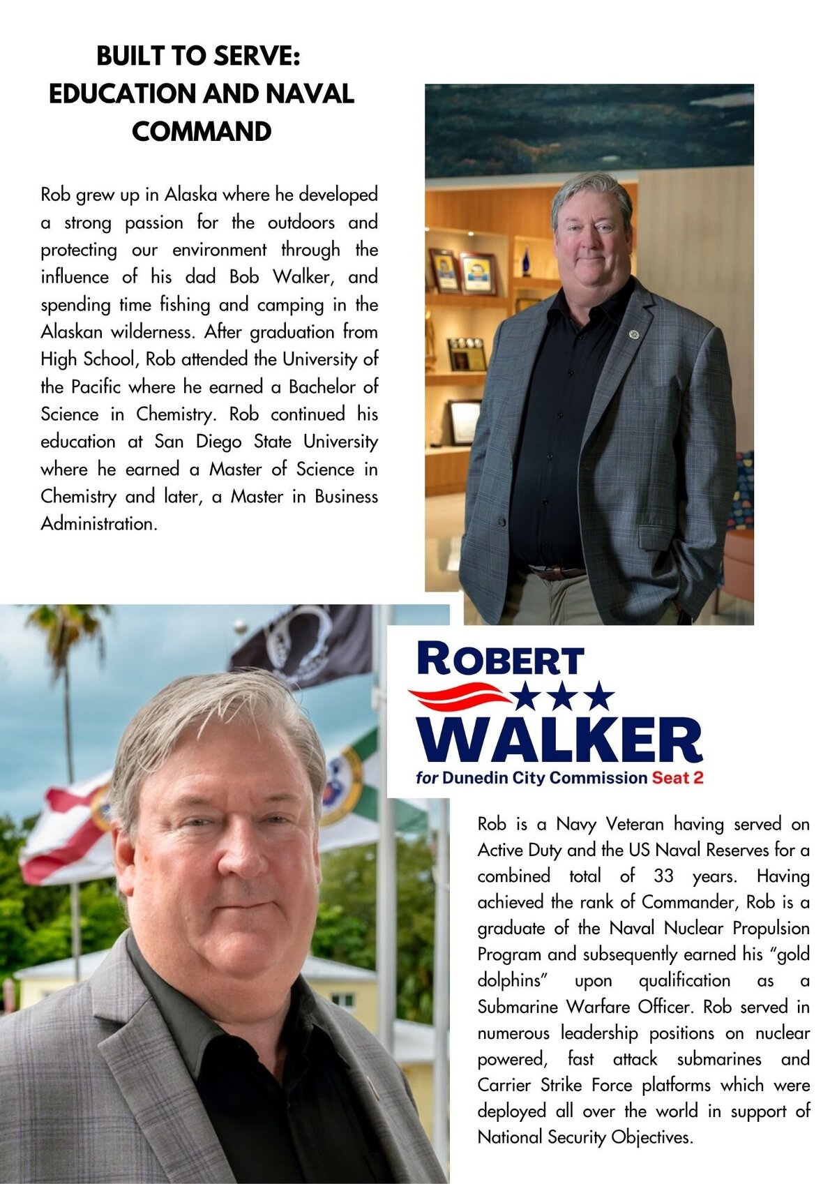 Robert "Rob" Walker is a Navy Veteran, small business owner, and dedicated public servant currently serving on the Dunedin City Commission. Elected in November 2022, Rob brings over three decades of military leadership, a strong background in science and business, and a deep commitment to environmental stewardship and community engagement. His passion for service is reflected in his active roles with local organizations, including the Rotary Club of Dunedin North, the Dunedin Boat Club, and several civic boards.
