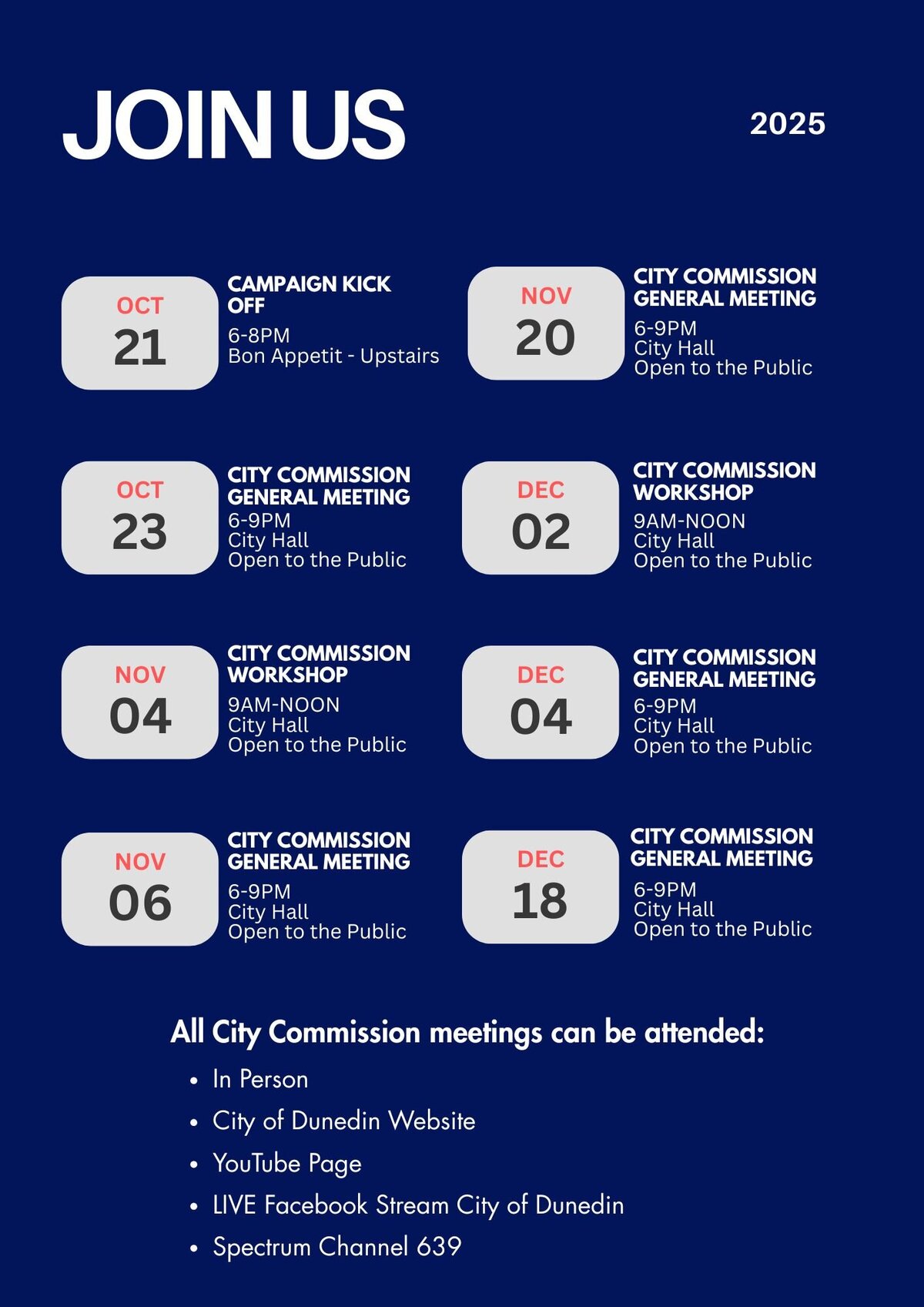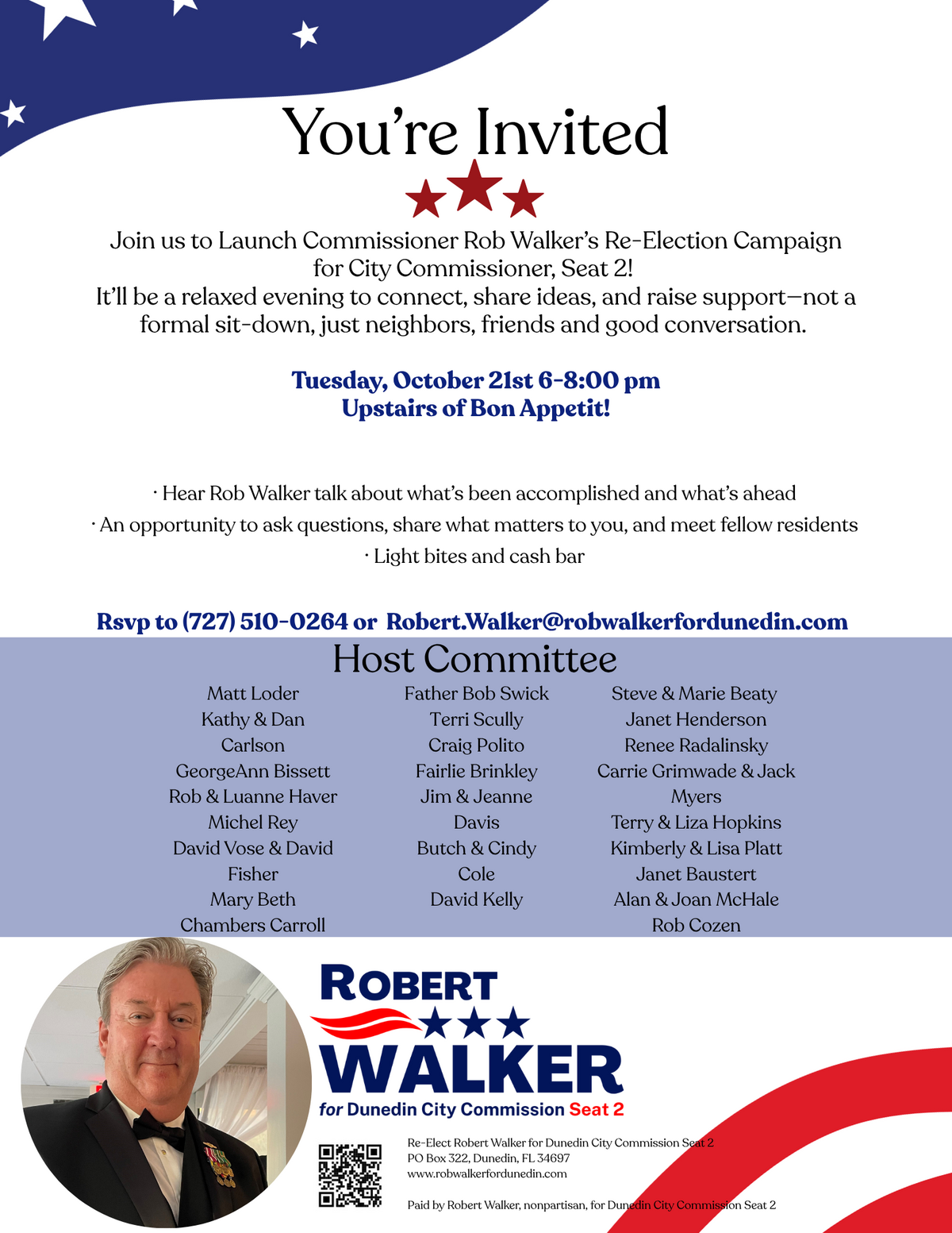Rob Walker’s campaign is rooted in community connection. Join us at upcoming events to talk about the issues that matter most—strong infrastructure, balanced growth, and resilient neighborhoods. Your participation helps shape the future of Dunedin.